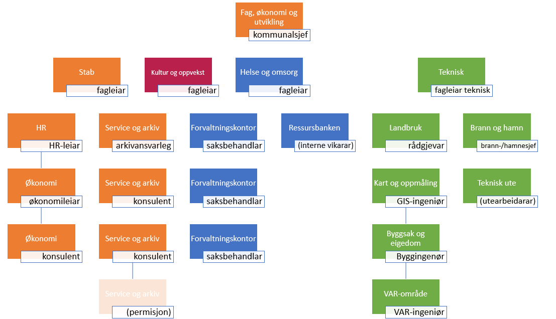 Kommunen har gjennomført ei administrativ omorganisering der ein har gått frå å ha ein tre-nivåmodell til ein to-nivåmodell med verknad frå 1.sept.2025. Tre kommunalsjefar og stabsleiar har fått nye stillingar, og ein har tilsett èin kommunalsjef for fag, økonomi og utvikling.